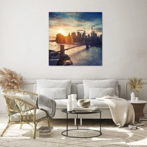 • Esta impresión en vidrio de 70 x 50 cm representa una puesta de sol sobre una ciudad con un puente en primer plano. Perfecta para interiores modernos.