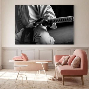 Cuadro sobre vidrio - Impresiones sobre Vidrio - Un samurái con kimono sosteniendo una katana en blanco y negro. - 80x120cm - Alma de guerrero - Decoración de pared moderna para salón y dormitorio ARTTOR
