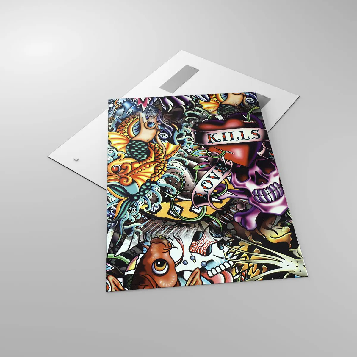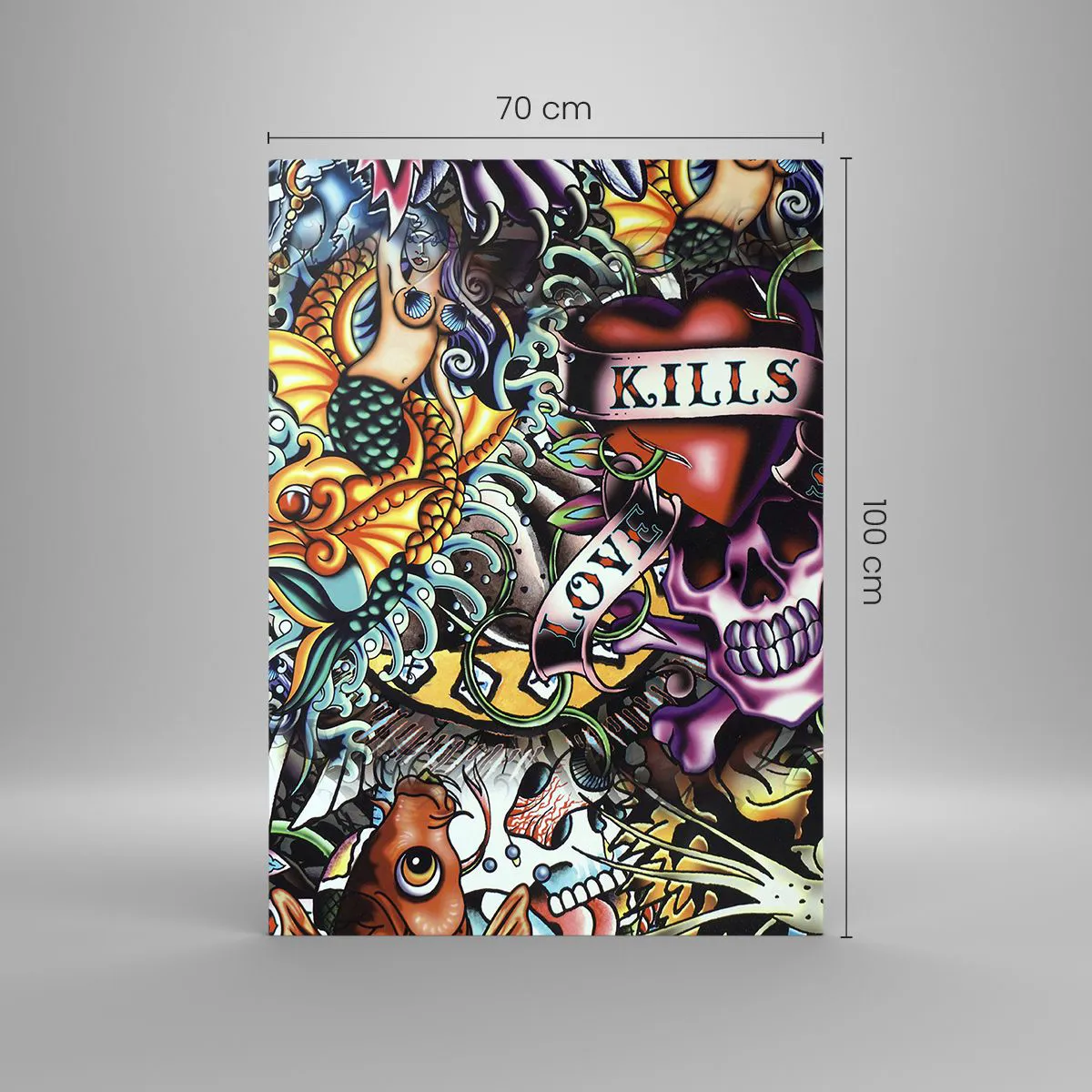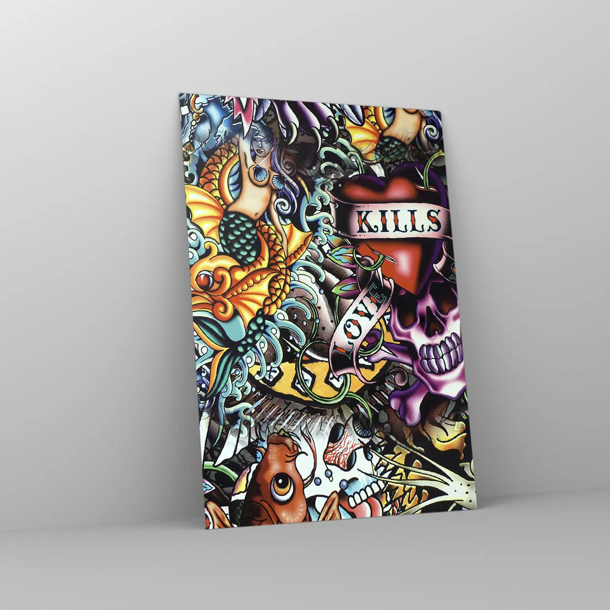 Cuadro sobre vidrio - Impresiones sobre Vidrio - Obra de arte colorida estilo tatuaje con calaveras y motivos náuticos. - 70x100cm - El sueño de un tatuador - Decoración de pared moderna para salón y dormitorio ARTTOR