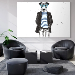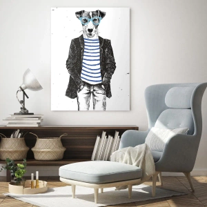 Cuadro sobre vidrio - Impresiones sobre Vidrio - Ilustración de un perro con camisa de marinero y gafas sobre un fondo blanco. - 100x70cm - El encanto del perro - Decoración de pared moderna para salón y dormitorio ARTTOR