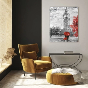Cuadro sobre vidrio - Impresiones sobre Vidrio - El Big Ben con un autobús rojo y un paraguas sobre un fondo de árboles otoñales - 50x70cm - Un día emocionante - Decoración de pared moderna para salón y dormitorio ARTTOR