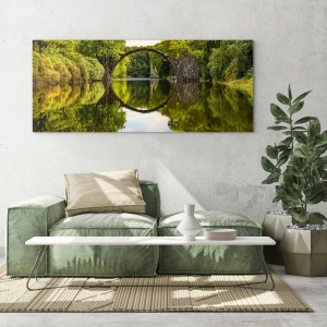 Cuadro sobre vidrio - Impresiones sobre Vidrio - Un puente de piedra reflejado en la tranquila superficie del lago. - 50x70cm - En el punto de encuentro de dos mundos - Decoración de pared moderna para salón y dormitorio ARTTOR