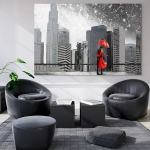Cuadro sobre vidrio - Impresiones sobre Vidrio - Una pareja con un paraguas rojo de pie frente a un paisaje urbano por la noche. - 50x70cm - Amor en la jungla urbana - Decoración de pared moderna para salón y dormitorio ARTTOR
