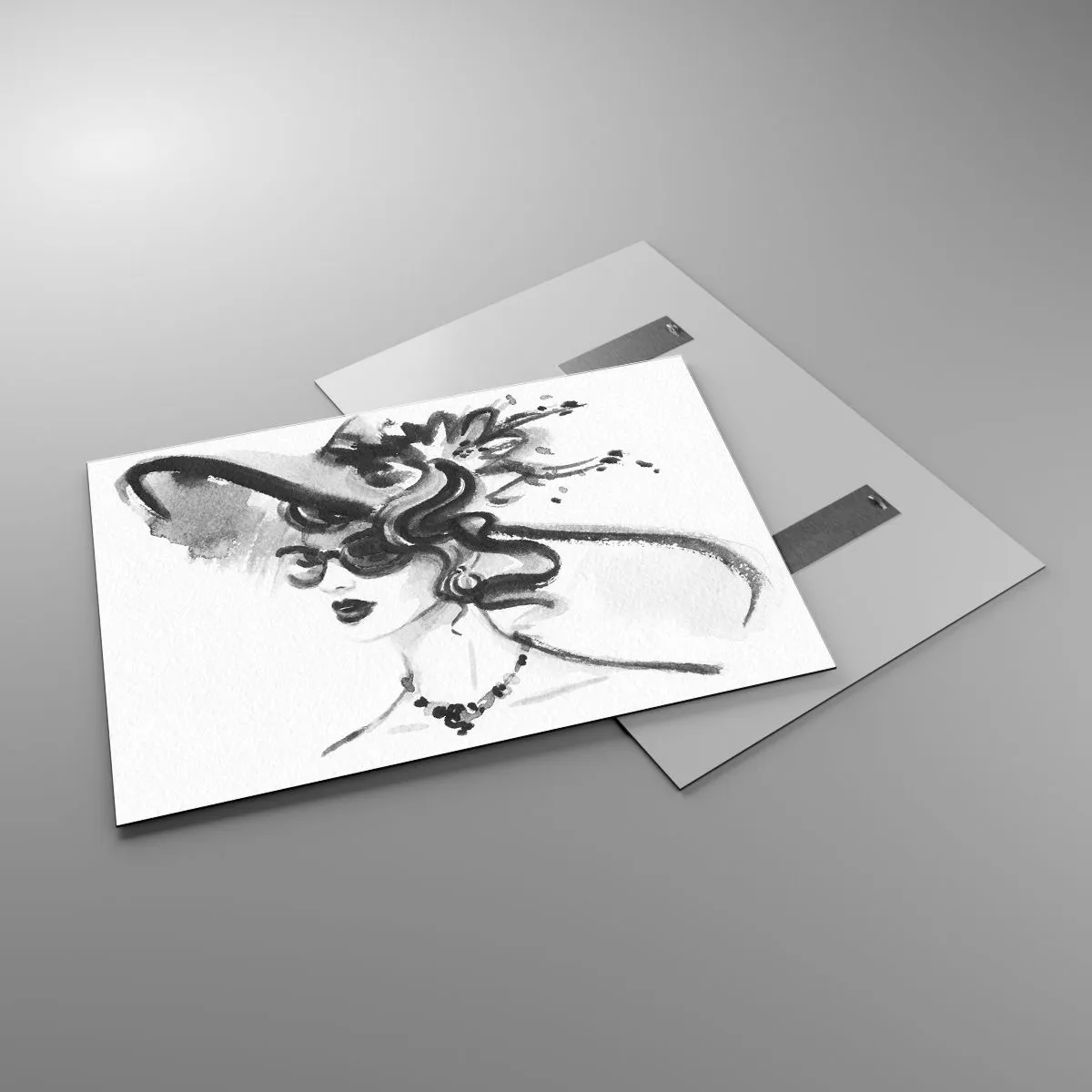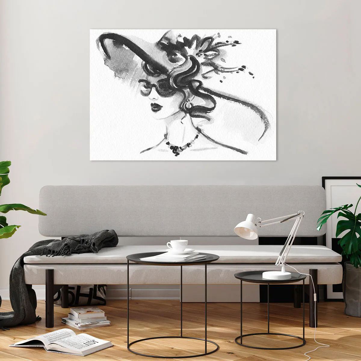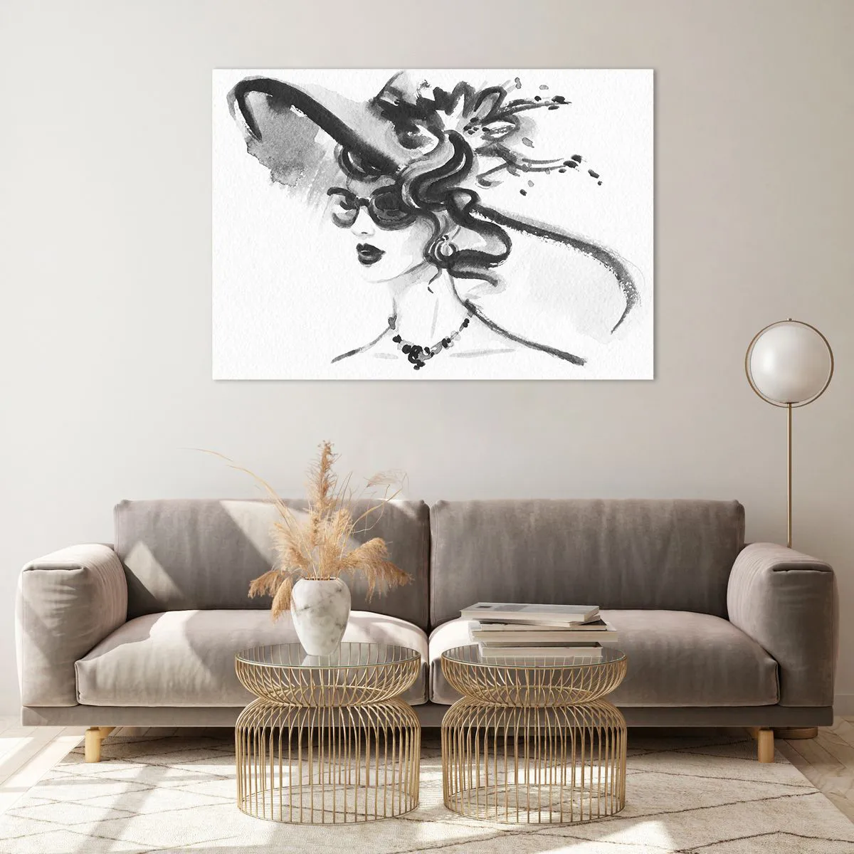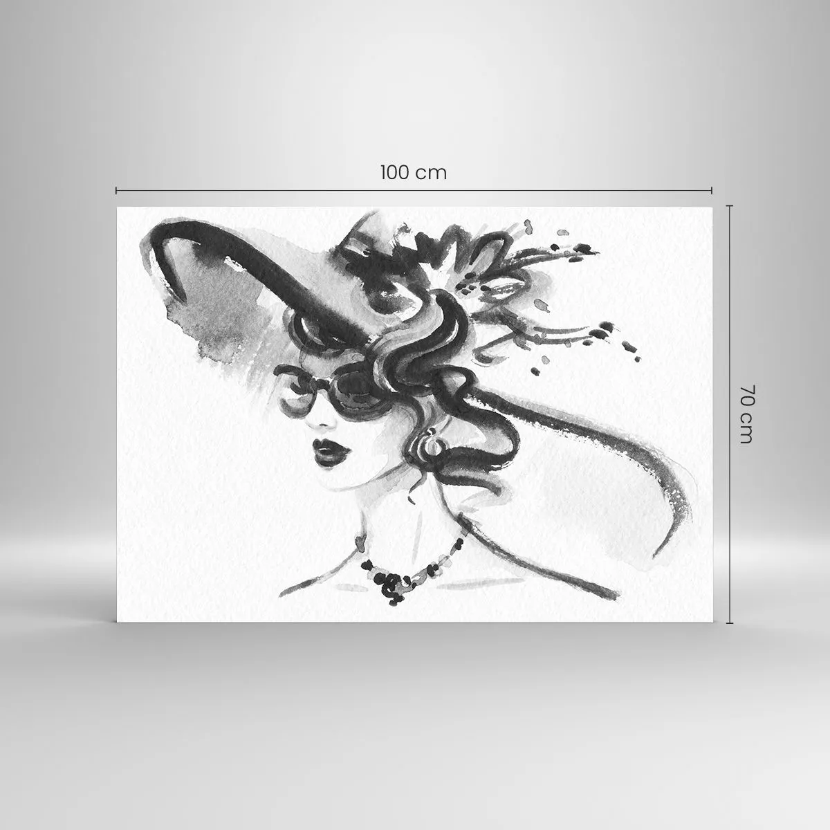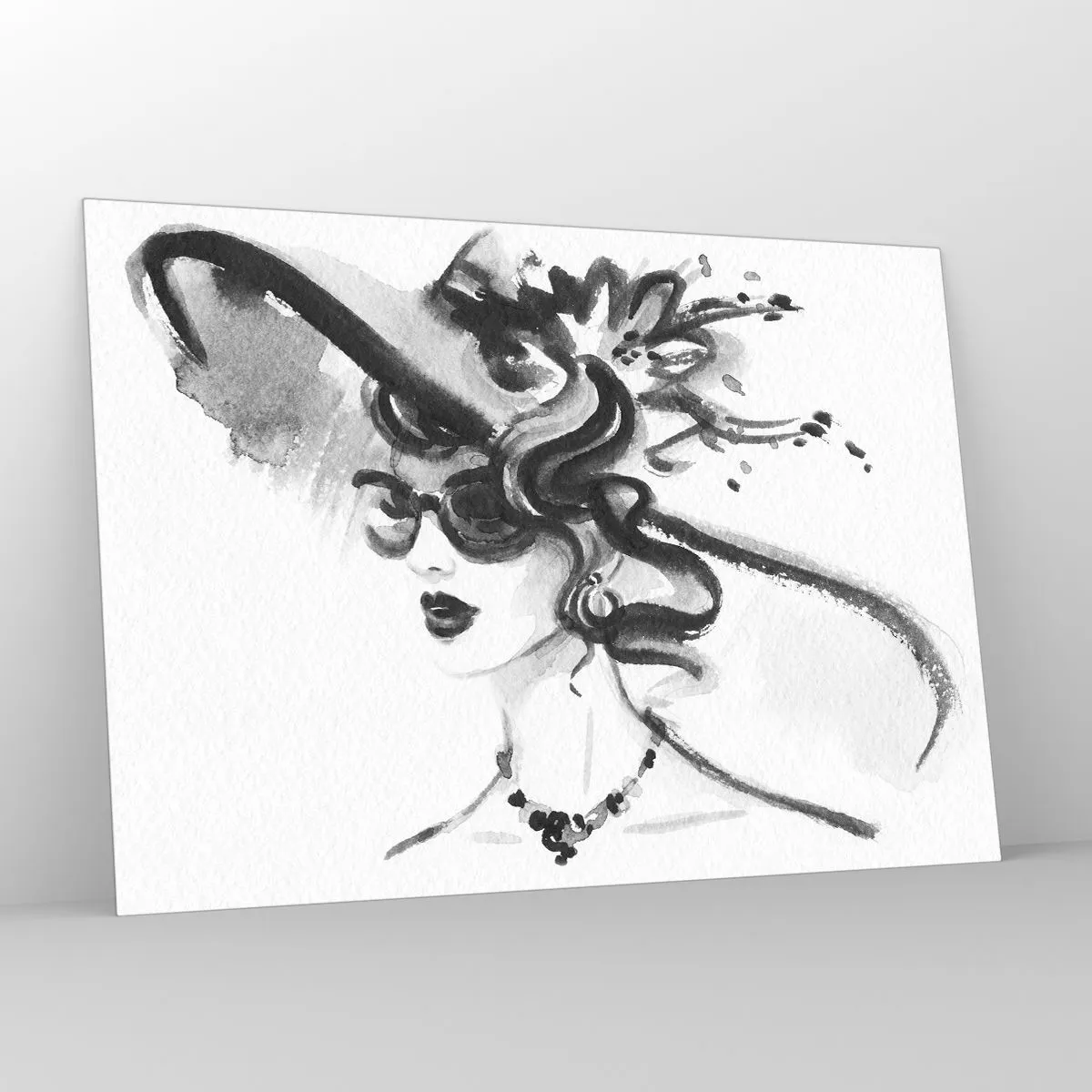 Cuadro sobre vidrio - Impresiones sobre Vidrio - Retrato en blanco y negro de una mujer con sombrero. - 100x70cm - Una dama con carácter - Decoración de pared moderna para salón y dormitorio ARTTOR