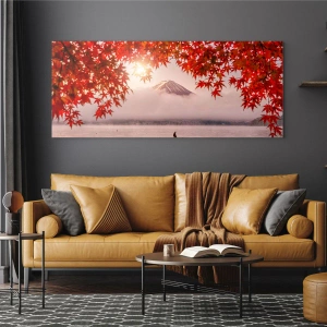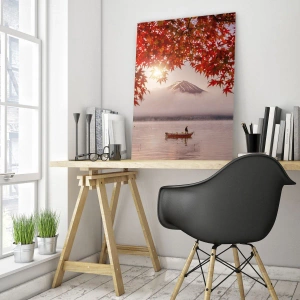 Cuadro sobre vidrio - Impresiones sobre Vidrio - Monte Fuji con un barco en un lago rodeado de hojas rojas - 70x50cm - Estilo japonés - Decoración de pared moderna para salón y dormitorio ARTTOR