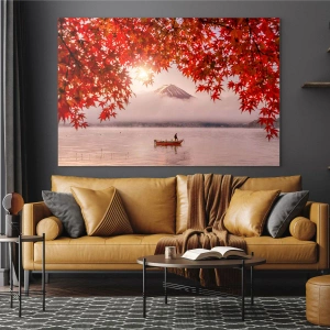 Cuadro mural - En un ambiente japonés - Monte Fuji con un barco en un lago rodeado de hojas rojas