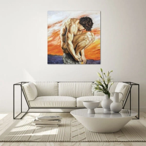 Cuadro sobre vidrio - Impresiones sobre Vidrio - Un cuerpo humano desnudo contra un cielo naranja intenso. - 70x50cm - Sumergido en sí mismo - Decoración de pared moderna para salón y dormitorio ARTTOR