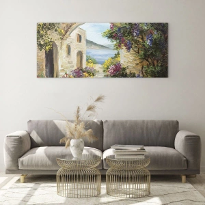 Cuadro sobre vidrio - Impresiones sobre Vidrio - Una calle pintoresca con vista al lago. - 120x80cm - El encanto del paisaje costero - Decoración de pared moderna para salón y dormitorio ARTTOR