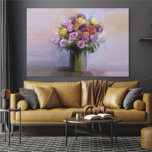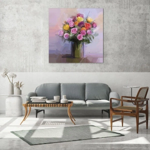 - Esta pintura representa un ramo de rosas en un jarrón de cristal sobre un sutil fondo pastel. Una decoración perfecta para crear un ambiente elegante y romántico.