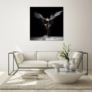 Cuadro sobre vidrio - Impresiones sobre Vidrio - Una bailarina entre nubes de polvo sobre un fondo negro. - 70x50cm - Los duendes existen - Decoración de pared moderna para salón y dormitorio ARTTOR