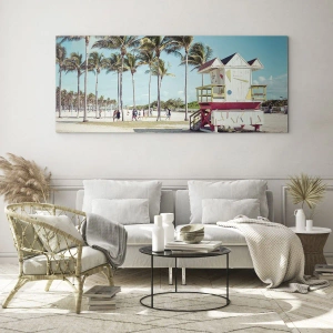 Cuadro sobre vidrio - Impresiones sobre Vidrio - Una playa con palmeras y una torre de salvavidas en un día soleado. - 50x70cm - Un hermoso día por delante - Decoración de pared moderna para salón y dormitorio ARTTOR