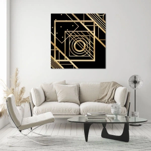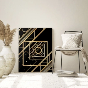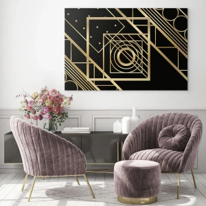 Cuadro sobre vidrio - Impresiones sobre Vidrio - Patrones geométricos dorados sobre un fondo negro - 50x70cm - Geometría dorada - Decoración de pared moderna para salón y dormitorio ARTTOR