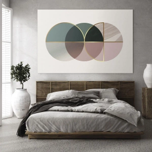 Cuadro sobre vidrio - Impresiones sobre Vidrio - Formas geométricas con tonos verdes y rosas sobre un fondo claro. - 100x70cm - Círculo tras círculo... - Decoración de pared moderna para salón y dormitorio ARTTOR