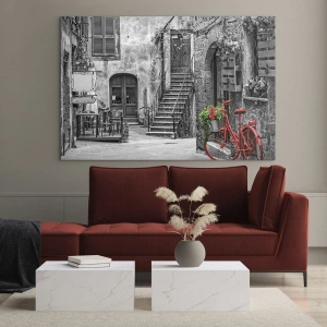 Cuadro sobre vidrio - Impresiones sobre Vidrio - Calle en blanco y negro con una bicicleta roja. - 50x70cm - Callejón de la Toscana - Decoración de pared moderna para salón y dormitorio ARTTOR
