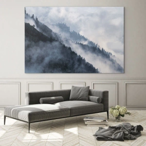 Cuadro sobre vidrio - Impresiones sobre Vidrio - Panorama de montaña brumoso con un bosque oscuro - 100x70cm - Misticismo de las montañas - Decoración de pared moderna para salón y dormitorio ARTTOR