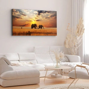 Cuadro sobre lienzo - Impresión de Imagen - Elefantes en la sabana al atardecer - 140x50cm - Un paseo en familia - Decoración de pared moderna para salón y dormitorio ARTTOR