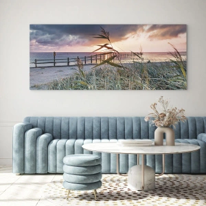 Cuadro sobre vidrio - Impresiones sobre Vidrio - Playa al atardecer con hierbas en primer plano - 80x120cm - Bailando con el viento - Decoración de pared moderna para salón y dormitorio ARTTOR