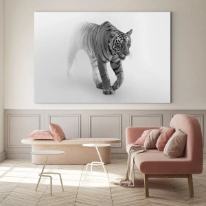 La impresión sobre vidrio permite obtener una silueta distintiva del tigre, resaltando los detalles y aportando profundidad a la pintura. "Agazapado en la niebla" es una pintura que captura la fuerza, el misterio y la elegancia de un animal salvaje, atrayendo la mirada con su sutil forma.