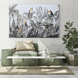 - Una escena decorativa con animales exóticos de la selva sobre un fondo de vegetación en blanco y negro y aves coloridas. Esta impresión en vidrio ARTTOR mide 70 x 50 cm y presenta un formato horizontal, perfecto para interiores modernos.