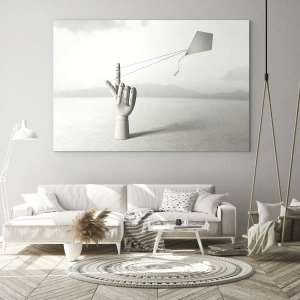 Cuadro sobre vidrio - Impresiones sobre Vidrio - Una mano de madera que sostiene una cometa flotante en su dedo. - 70x50cm - Una prueba de fuerza - Decoración de pared moderna para salón y dormitorio ARTTOR