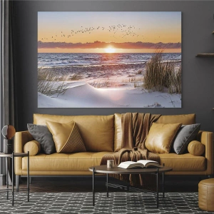Cuadro sobre vidrio - Impresiones sobre Vidrio - Puesta de sol sobre el mar con pájaros y dunas de arena. - 120x80cm - Paisaje horizontal - Decoración de pared moderna para salón y dormitorio ARTTOR