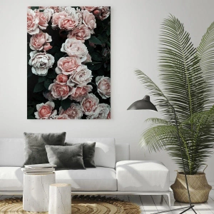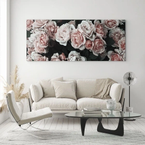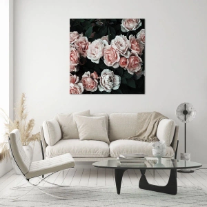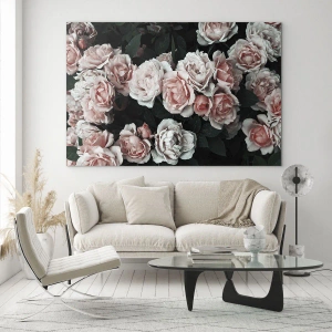 Cuadro sobre vidrio - Impresiones sobre Vidrio - Rosas rosadas sobre un fondo oscuro en una composición sutil. - 70x100cm - Conjunto de rosas - Decoración de pared moderna para salón y dormitorio ARTTOR