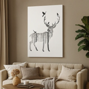 El lienzo "Silueta de un ciervo con bosque y pájaros" es una decoración única que combina la sutileza del estilo minimalista con la inspiración natural. La silueta del ciervo presenta un motivo forestal, y las ramas de sus astas están decoradas con aves, lo que le da al conjunto un carácter simbólico y artístico. La paleta de colores monocromática en blanco y negro realza la armonía y la elegancia de la composición.