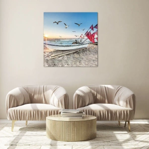 - Una pintura sobre vidrio que representa un viejo barco pesquero en una playa de arena al amanecer, con gaviotas planeando y banderas rojas ondeando al viento. Una escena atmosférica y tranquila, llena de encanto costero.