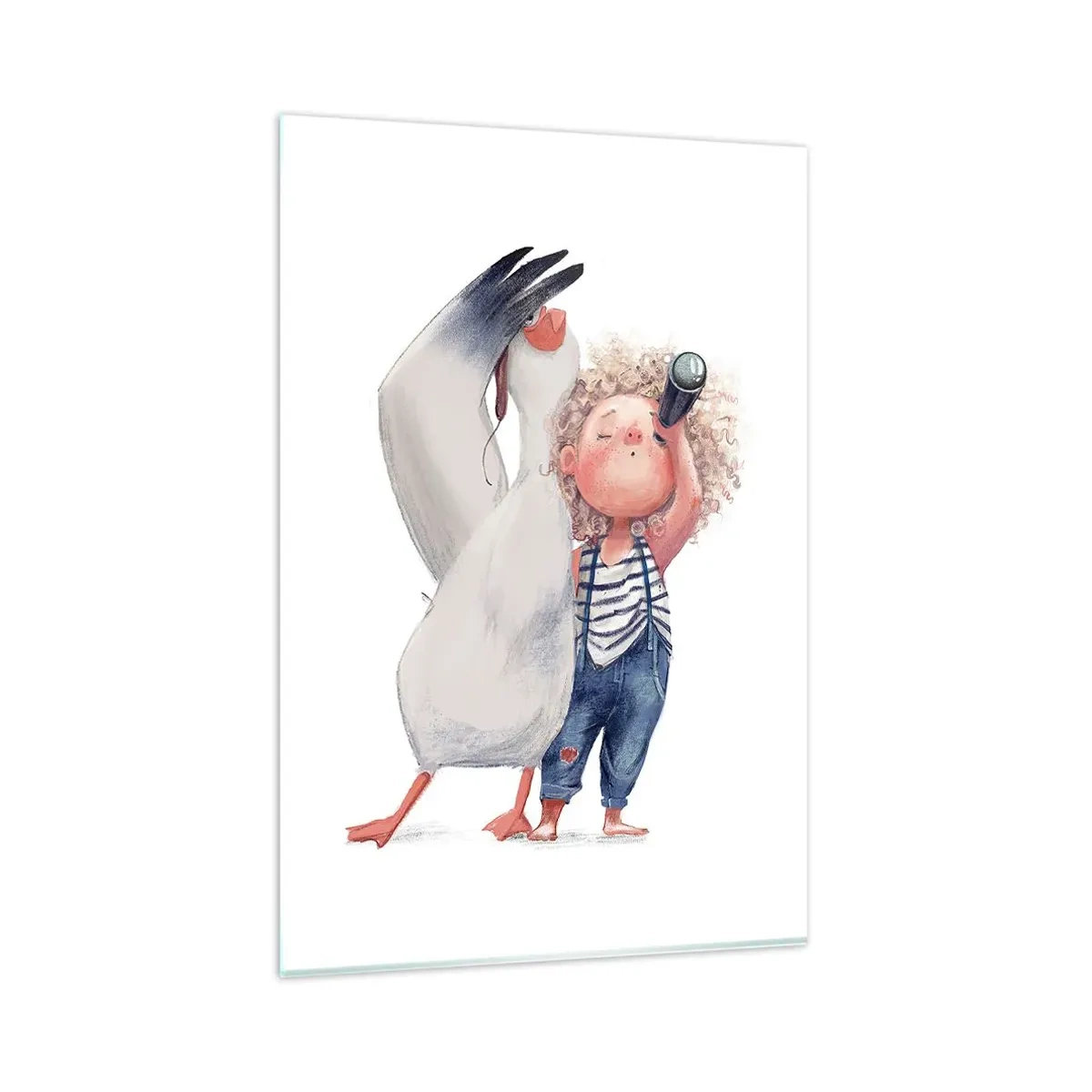 Cuadro sobre vidrio - Impresiones sobre Vidrio - Ilustración de un niño con un pelícano y un telescopio en la mano. - 80x120cm - Un plan para un gran viaje - Decoración de pared moderna para salón y dormitorio ARTTOR