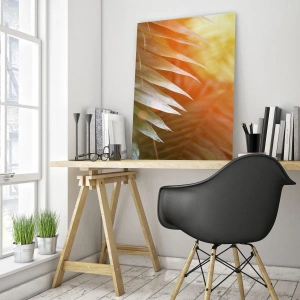Cuadro sobre vidrio - Impresiones sobre Vidrio - Hojas de palma en los rayos del atardecer. - 140x50cm - Mañana en la selva - Decoración de pared moderna para salón y dormitorio ARTTOR