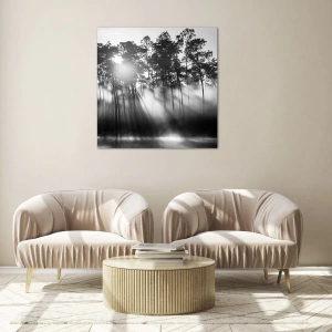 Cuadro sobre vidrio - Impresiones sobre Vidrio - Árboles en blanco y negro en un bosque con rayos de sol en la bruma. - 70x50cm - Sol imparable - Decoración de pared moderna para salón y dormitorio ARTTOR