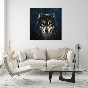 Cuadro sobre vidrio - Impresiones sobre Vidrio - Un lobo sobre un fondo de bosque oscuro en un estilo realista. - 50x70cm - ¿Alfa? Y omega - Decoración de pared moderna para salón y dormitorio ARTTOR