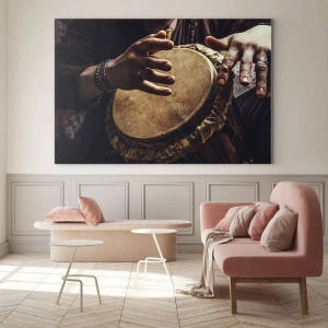 Cuadro sobre vidrio - Impresiones sobre Vidrio - Primer plano de manos tocando un tambor djembé con luz cálida. - 100x70cm - En el ritmo del corazón - Decoración de pared moderna para salón y dormitorio ARTTOR