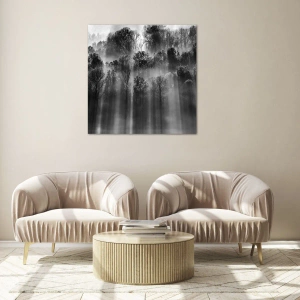 Cuadro sobre vidrio - Impresiones sobre Vidrio - Bosque blanco y negro a la luz de la mañana. - 80x120cm - En los flujos de luz - Decoración de pared moderna para salón y dormitorio ARTTOR