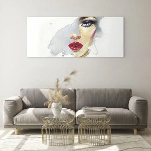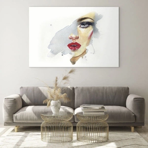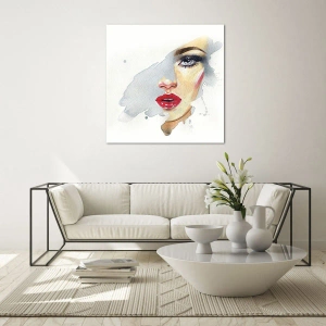 Cuadro sobre vidrio - Impresiones sobre Vidrio - Retrato en acuarela de una mujer con labios rojos. - 70x50cm - Reflejo en una gota de agua - Decoración de pared moderna para salón y dormitorio ARTTOR