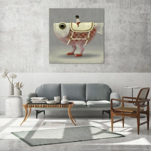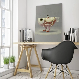 Cuadro sobre vidrio - Impresiones sobre Vidrio - Una figura montando un pez rosa con piernas y una silla de montar. - 50x70cm - Jinete del pescado - Decoración de pared moderna para salón y dormitorio ARTTOR