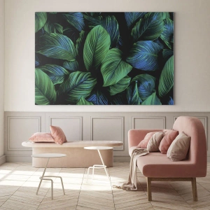 La impresión en vidrio "En una multitud verde" representa un denso grupo de hojas verdes, cuyos intensos colores y distintiva estructura aportan una atmósfera tropical al interior. El primer plano de las formas de las plantas crea la sensación de estar inmerso en la vegetación, y la combinación de tonos sobre un fondo oscuro aporta profundidad y elegancia a la composición.