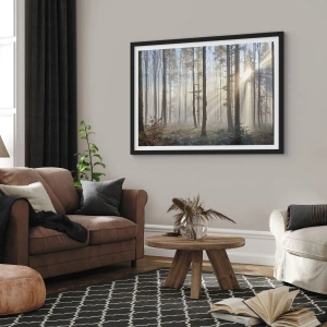 Póster en marco negro - Una mañana brumosa en el bosque con rayos de sol. - 50x70cm - La niebla también está despierta - Decoración de pared moderna para salón y dormitorio ARTTOR
