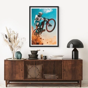 Póster en marco negro - Un ciclista de montaña realiza un salto dinámico frente a un paisaje desértico. - 50x70cm - Locura sobre dos ruedas - Decoración de pared moderna para salón y dormitorio ARTTOR