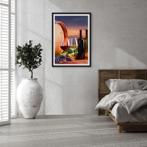 Póster en marco negro - Vino, copas y un barril en un paisaje pintoresco. - 70x50cm - Aquí la vida tiene un sabor - Decoración de pared moderna para salón y dormitorio ARTTOR