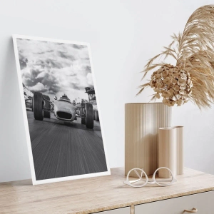 Póster - Coche de carreras retro en pista en blanco y negro - 50x70cm - ¡Hay poder! - Decoración de pared moderna para salón y dormitorio ARTTOR
