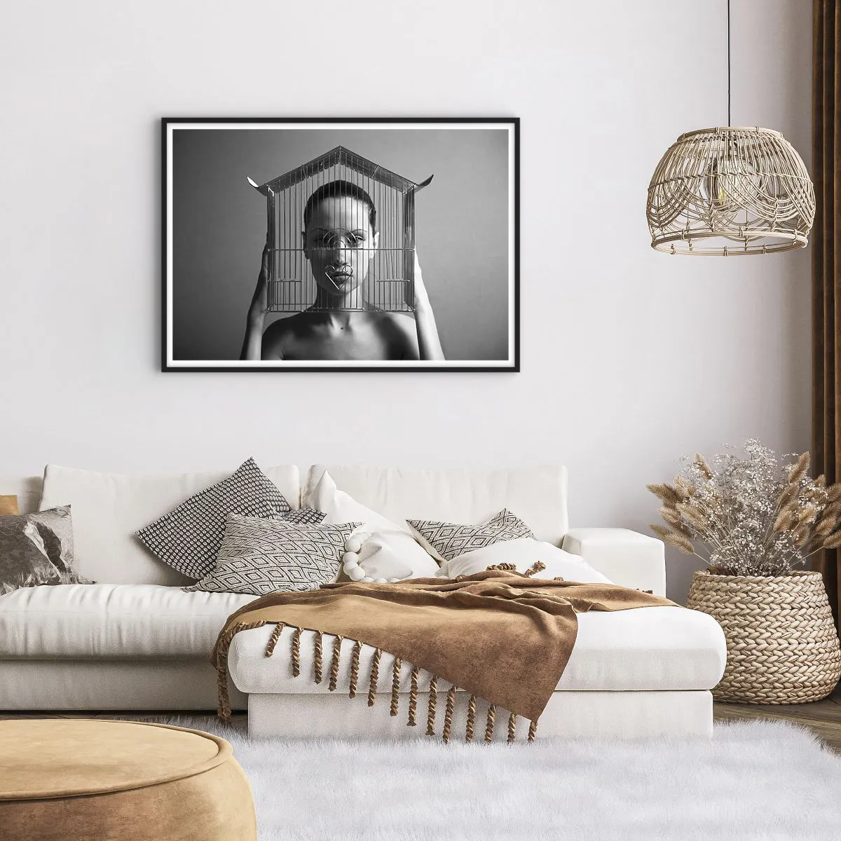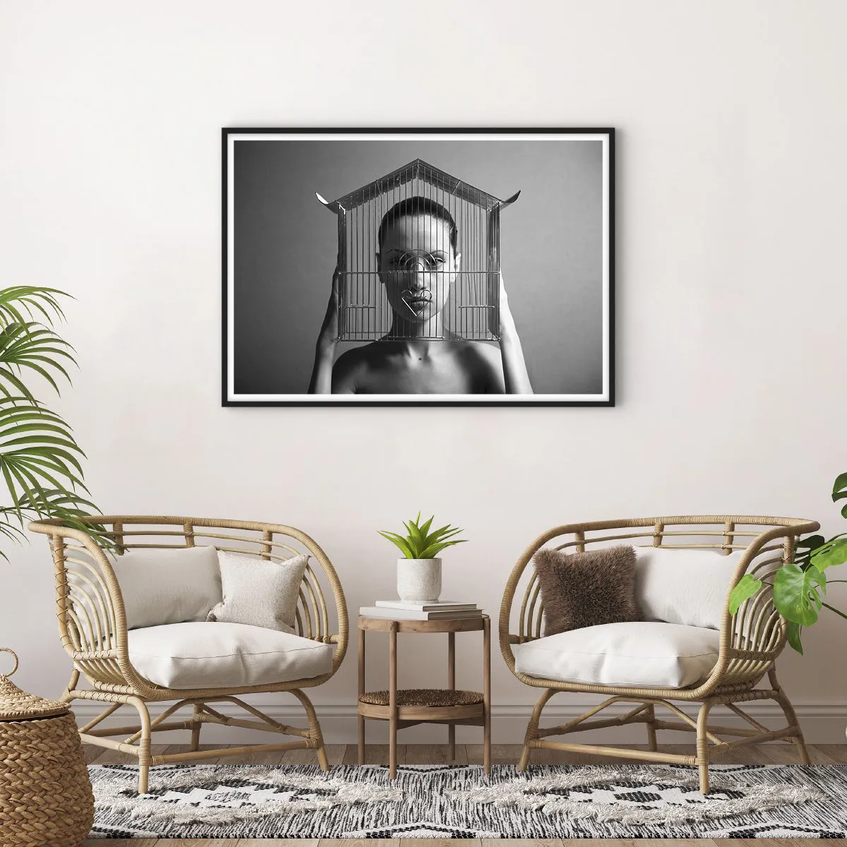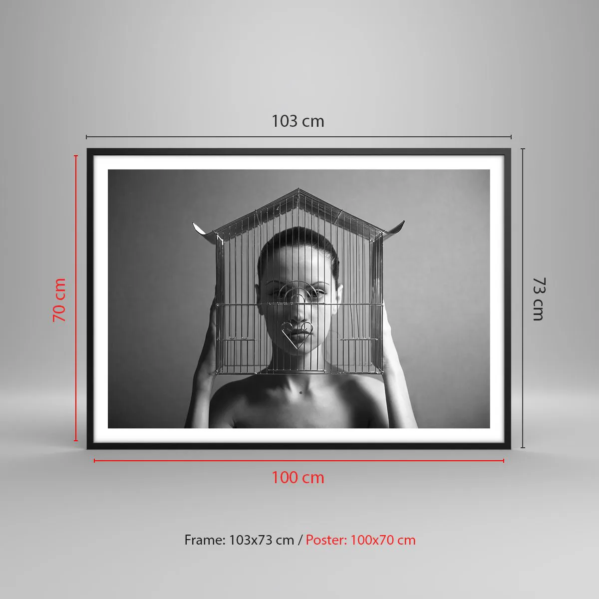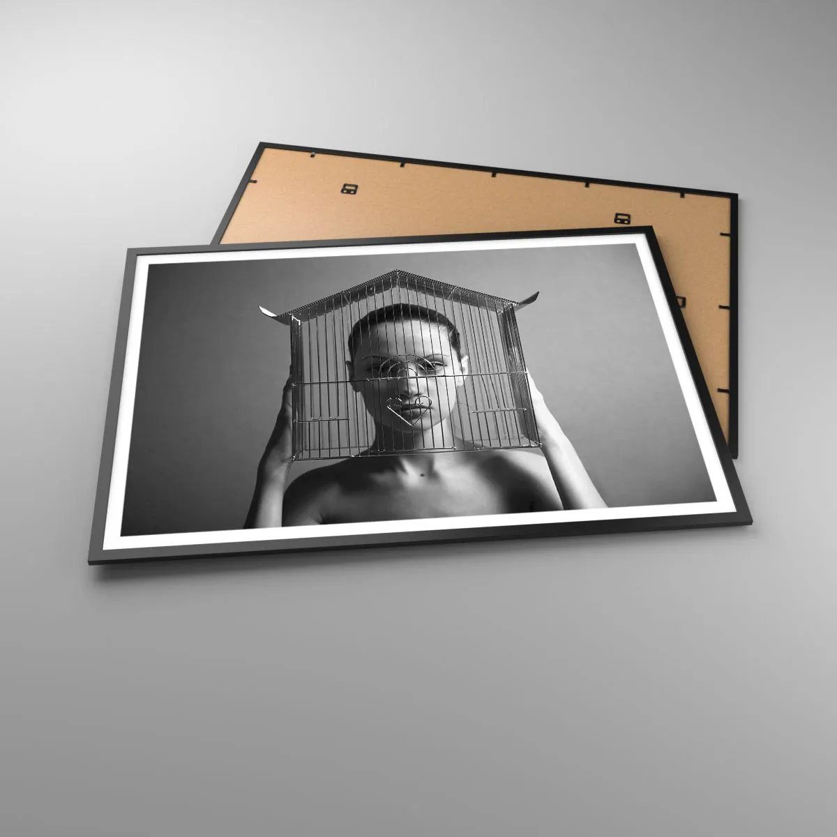 Póster en marco negro - Mujer detrás de una jaula en un estilo surrealista. - 100x70cm - Un retrato algo surrealista - Decoración de pared moderna para salón y dormitorio ARTTOR