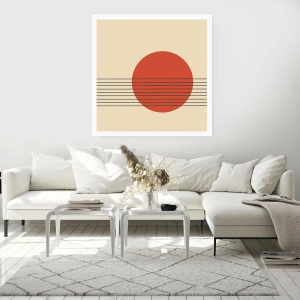 Póster - Círculo rojo abstracto con líneas sobre fondo beige. - 100x70cm - Cruzando el círculo - Decoración de pared moderna para salón y dormitorio ARTTOR