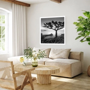 Póster - Paisaje en blanco y negro con un árbol solitario sobre un acantilado. - 50x70cm - Calma hasta el horizonte - Decoración de pared moderna para salón y dormitorio ARTTOR
