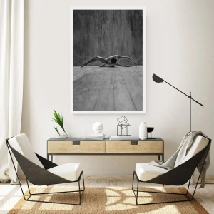 Póster - Una bailarina en pose artística en un escenario de madera. - 50x70cm - Simetría encontrada - Decoración de pared moderna para salón y dormitorio ARTTOR