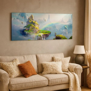 - Esta pintura representa mágicas islas flotantes entre las nubes con un arcoíris en el horizonte. Perfecta para interiores que buscan incorporar elementos mágicos y fantásticos a su decoración.