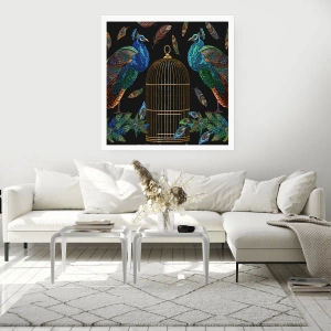Póster - Pavos reales junto a una jaula dorada sobre un fondo negro - 100x70cm - Con plumajes reales - Decoración de pared moderna para salón y dormitorio ARTTOR