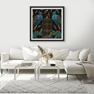 Póster en marco negro - Pavos reales junto a una jaula dorada sobre un fondo negro - 70x50cm - Con plumajes reales - Decoración de pared moderna para salón y dormitorio ARTTOR