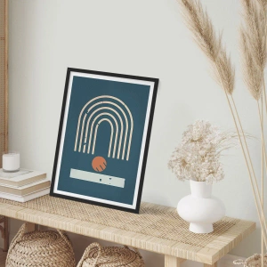 Póster en marco negro - Patrón geométrico en tonos azul marino, beige y naranja sobre un fondo oscuro. - 70x50cm - Geometría sobre azul marino - Decoración de pared moderna para salón y dormitorio ARTTOR