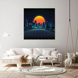 - La pintura representa un paisaje urbano futurista en tonos neón. Perfecta para interiores modernos que valoran una estética distintiva y un estilo retro.